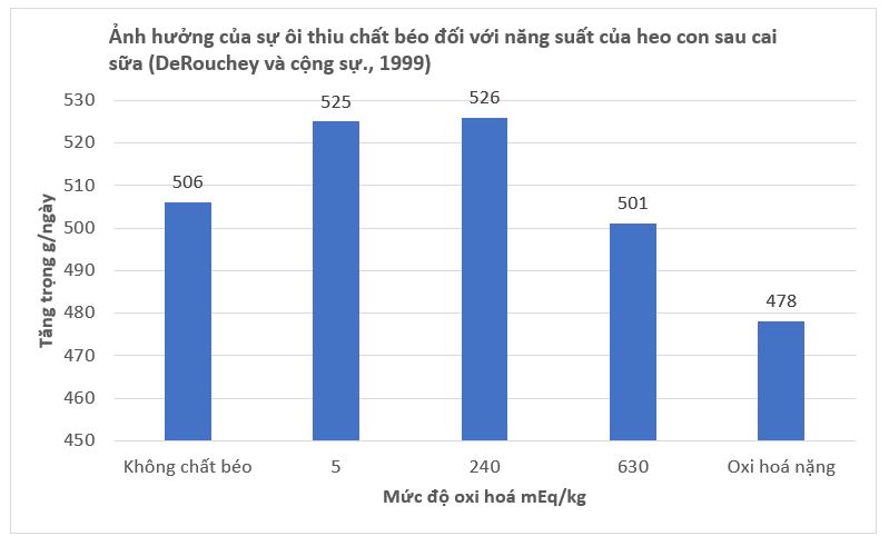 Bổ sung mỡ trắng (mỡ heo) ở mức 6% trong khẩu phần làm tăng mức ôi thiu, tỷ lệ tăng trưởng giảm tuyến tính và lượng ăn vào trong khẩu phần heo cai sữa được cho ăn khẩu phần khởi động phức tạp (DeRouchey et al., 1999). Từ cùng một nghiên cứu, người ta đã chứng minh rằng nồng độ của peroxit trong khẩu phần không nên vượt quá 240 mEq để ngăn chặn sự suy giảm năng suất tăng trưởng.